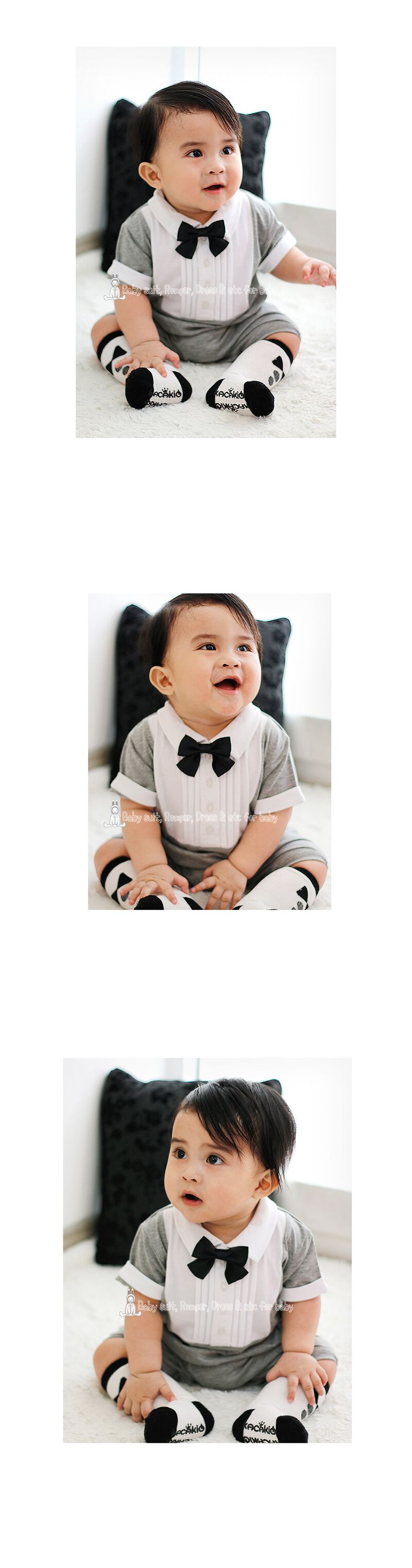 리본형 보타이가 탈부착 가능한 레슬리 보타이 롬퍼입니다. 보타이만 부착해주면 드레시한 정장풍 외출복 롬퍼가 됩니다.