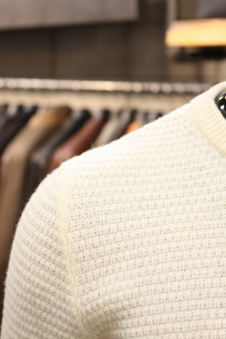 이태리에서 직수입된 밝고 화사한 아이보리화이트컬러의 코디하기 좋은 라운드넥스웨터 입니다