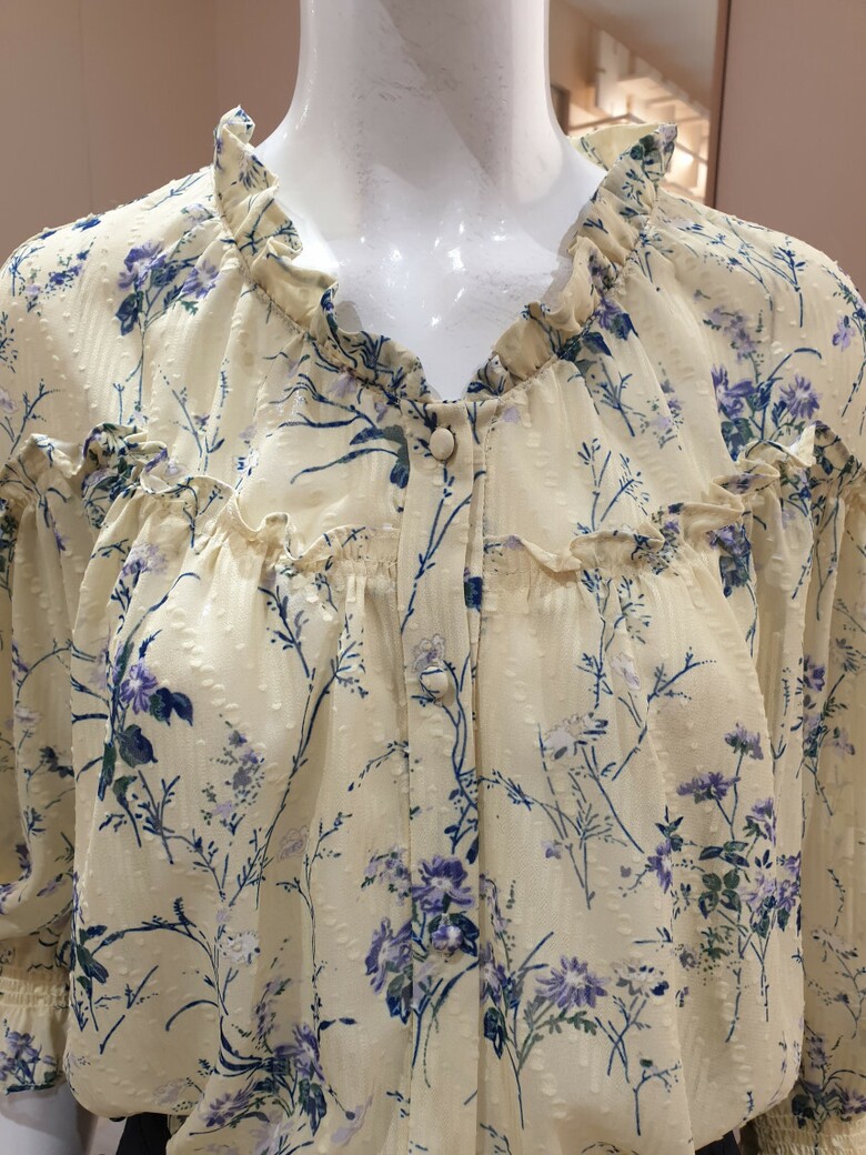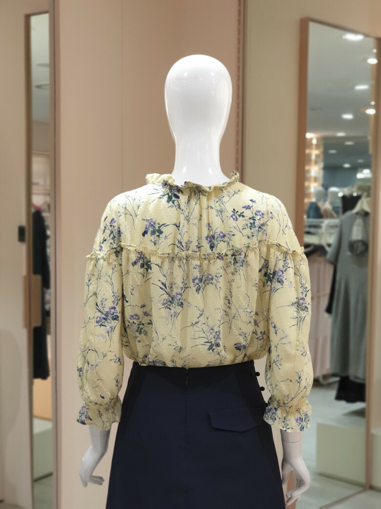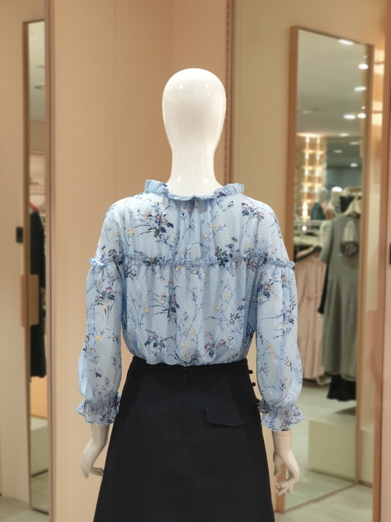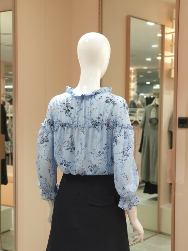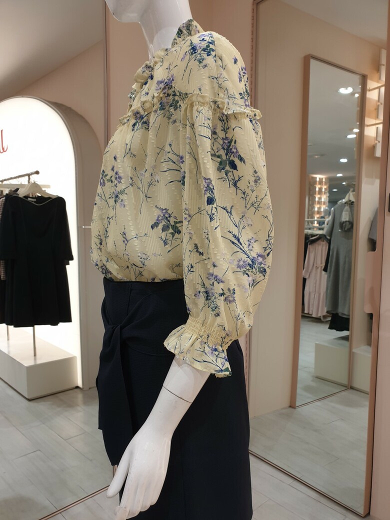 프릴 장식되어 로맨틱한 감성을 즐길 수 있는 플로럴 패턴 블라우스입니다.