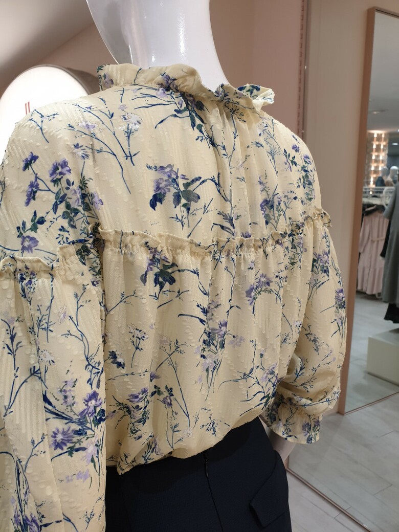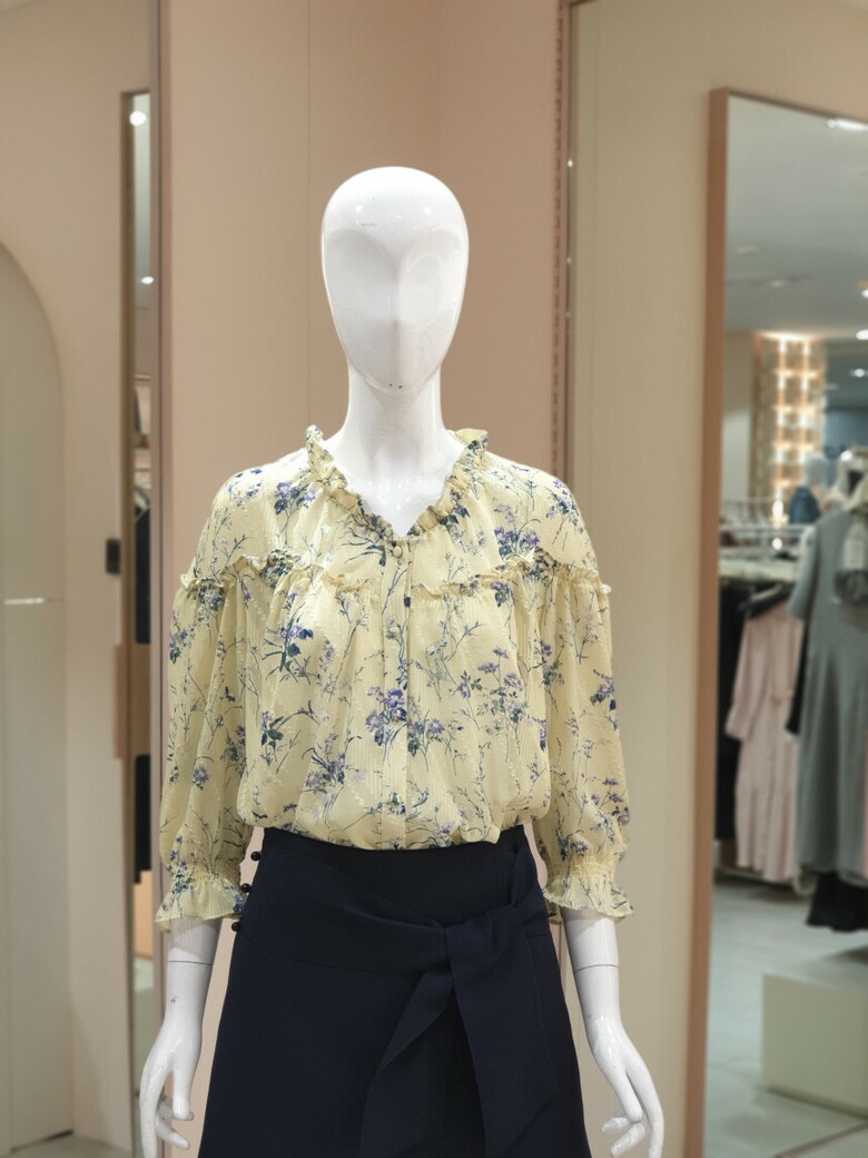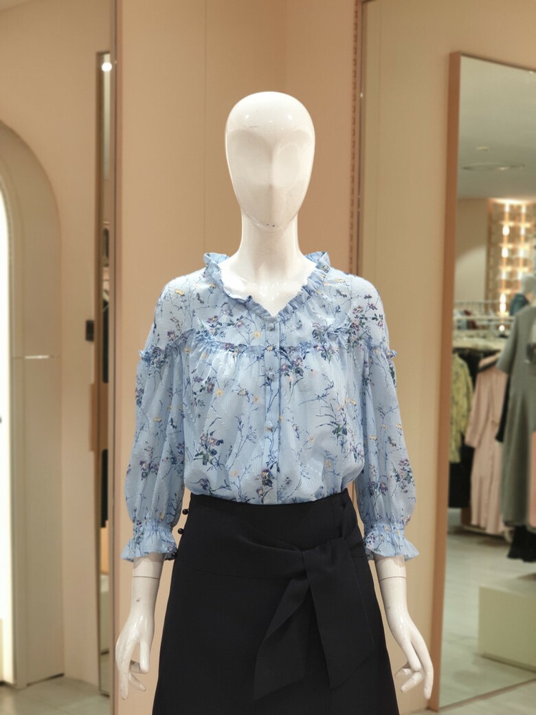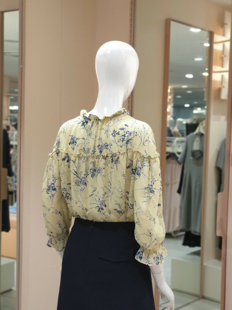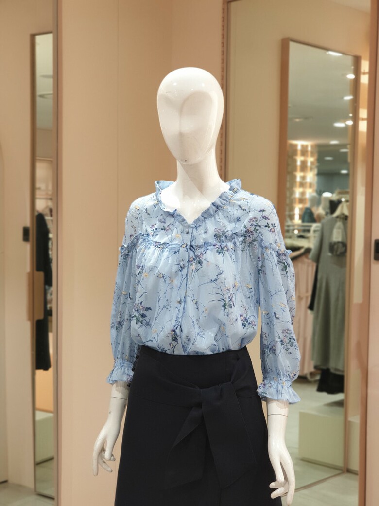 프릴 장식되어 로맨틱한 감성을 즐길 수 있는 플로럴 패턴 블라우스입니다.