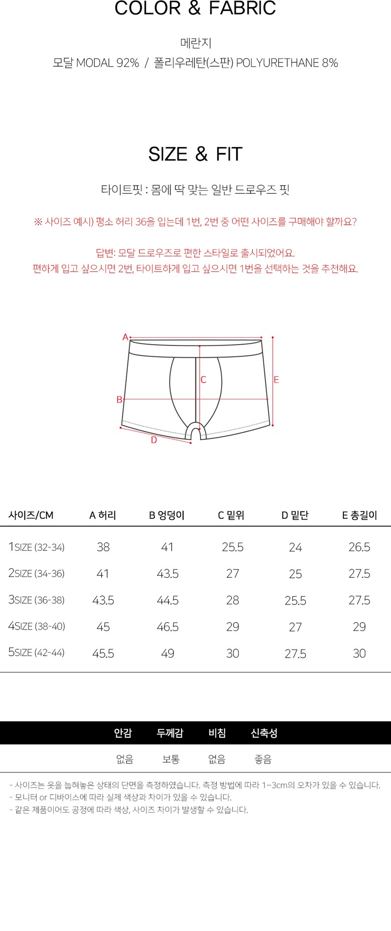 | 1. 제품 소재 (섬유의 조성 또는 혼용률을 백분율로 표시, 기능성인 경우 성적서 또는 허가서) | 모달92%.스판8% |