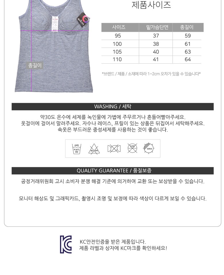 | 6. 세탁방법 및 취급시 주의사항 | 30도 온수로 중성세제를 사용하여 손세탁 및 분리세탁을 권장합니다. |