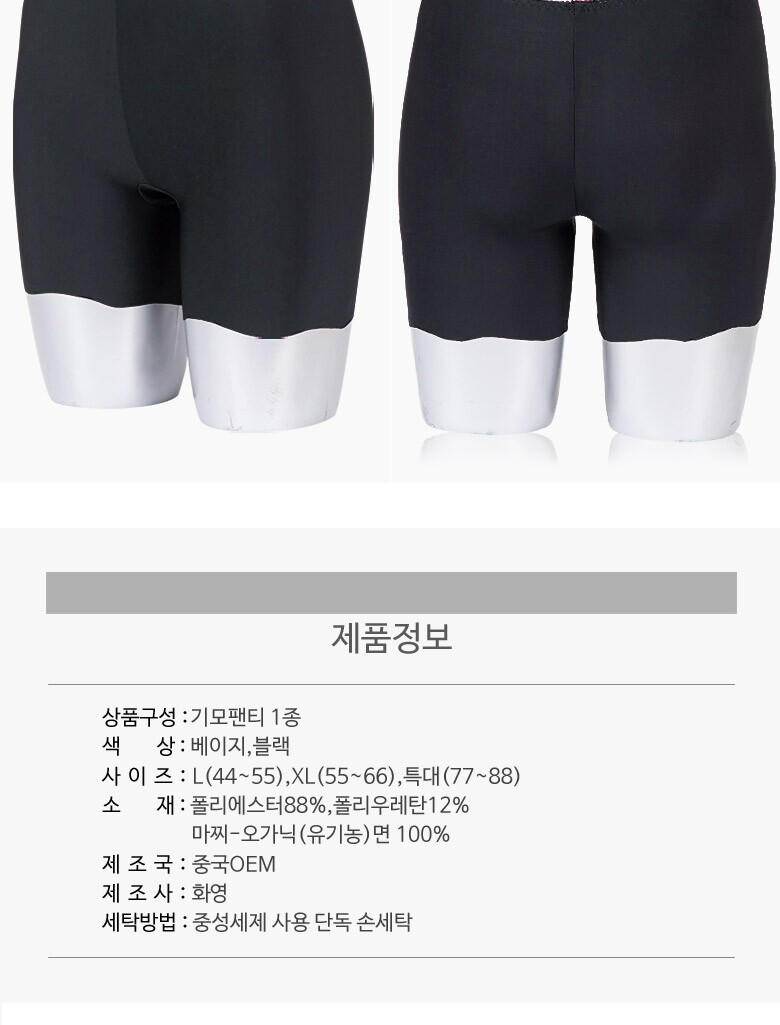1. 제품 소재 (섬유의 조성 또는 혼용률을 백분율로 표시, 기능성인 경우 성적서 또는 허가서) | 1.폴리에스터88%,폴리우레탄12% 2.오가닉(유기농)면100% |