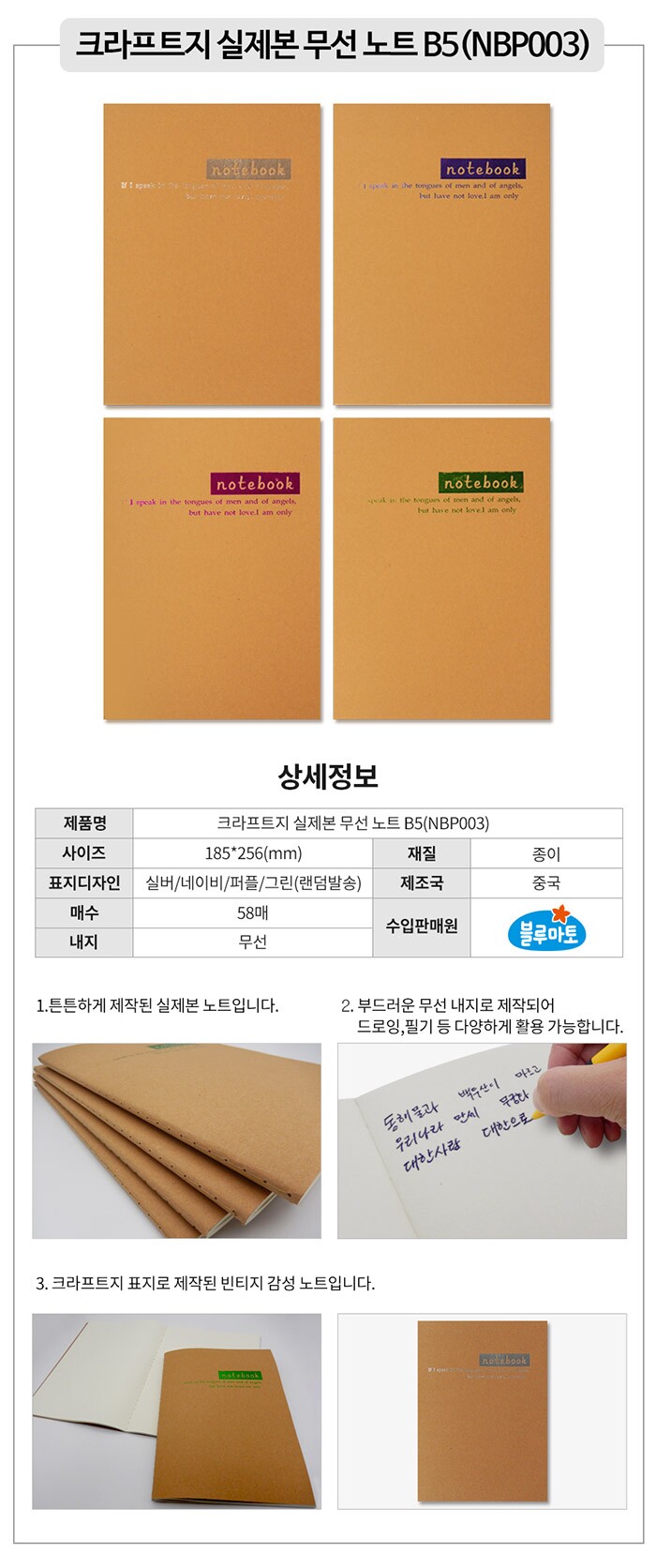 [블루마토] 크라프트지 실제본 무선 노트 B5 (NBP003) 3권세트
