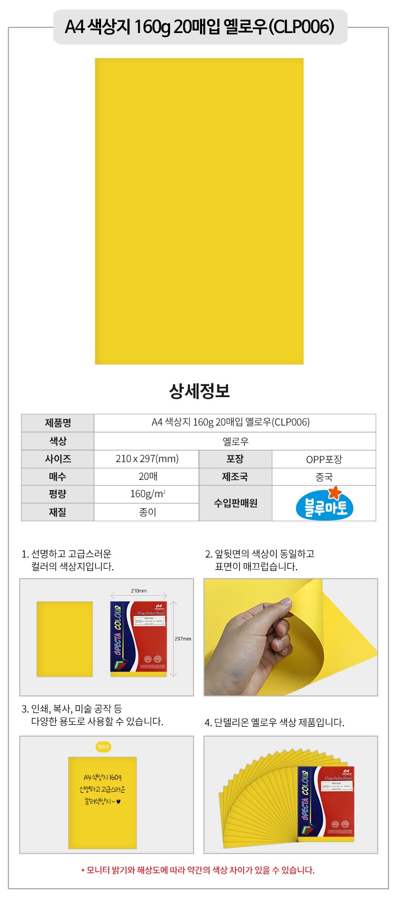 [블루마토] A4 색상지 160g 20매입 옐로우(CLP006) 3세트