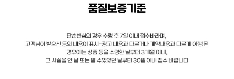 상품불량에 의한 반품, A/S, 품질보증 및 피해보상 등에 관한 사항은 소비자 분쟁해결기준(공정거래위원회 고시) 구매자가 미성년자인 경우에는 상품 구입시 법정대리인이 동의하지 아니하면 미성년자 본인 또는 법정대리인이 구매취소 할 수 있습니다. |