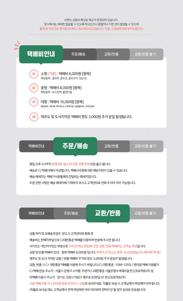 배송안내, 교환 및 반품 안내, 기타 기준 사항