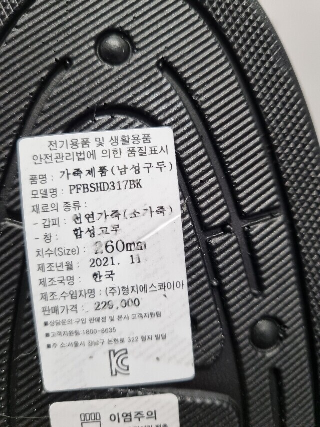 | 1. 제품 소재 (운동화인 경우에는 겉감, 안감을 구분하여 표시) | 소가죽 |