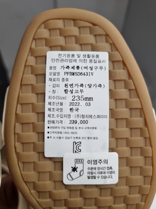 | 1. 제품 소재 (운동화인 경우에는 겉감, 안감을 구분하여 표시) | 양가죽 |