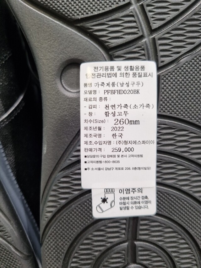 | 1. 제품 소재 (운동화인 경우에는 겉감, 안감을 구분하여 표시) | 소가죽 |