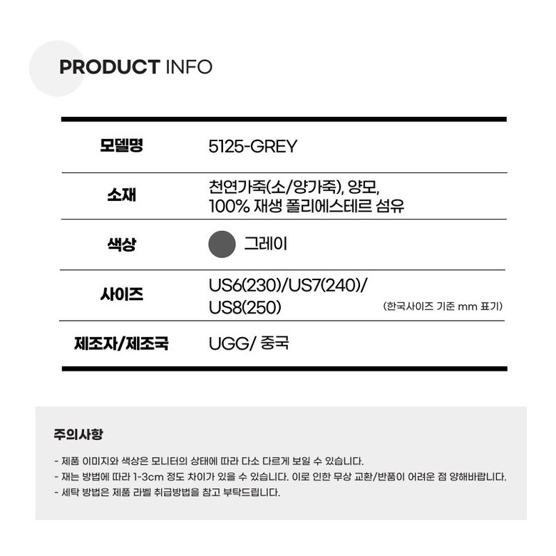 1. 제품 소재 (운동화인 경우에는 겉감, 안감을 구분하여 표시) 천연가죽(소/양가죽), 양모, 100% 재생 폴리에스테르 섬유