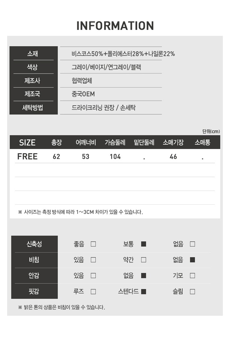 1. 제품 소재 (섬유의 조성 또는 혼용률을 백분율로 표시, 기능성인 경우 성적서 또는 허가서) | 상세페이지참고 |