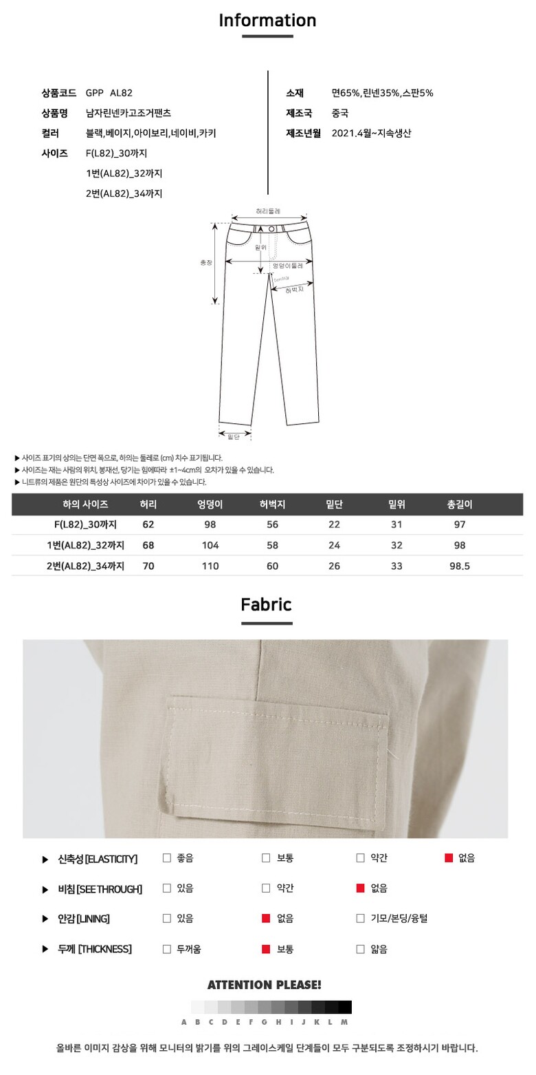 | 1. 제품 소재 (섬유의 조성 또는 혼용률을 백분율로 표시, 기능성인 경우 성적서 또는 허가서) | 상세이미지 참조 |