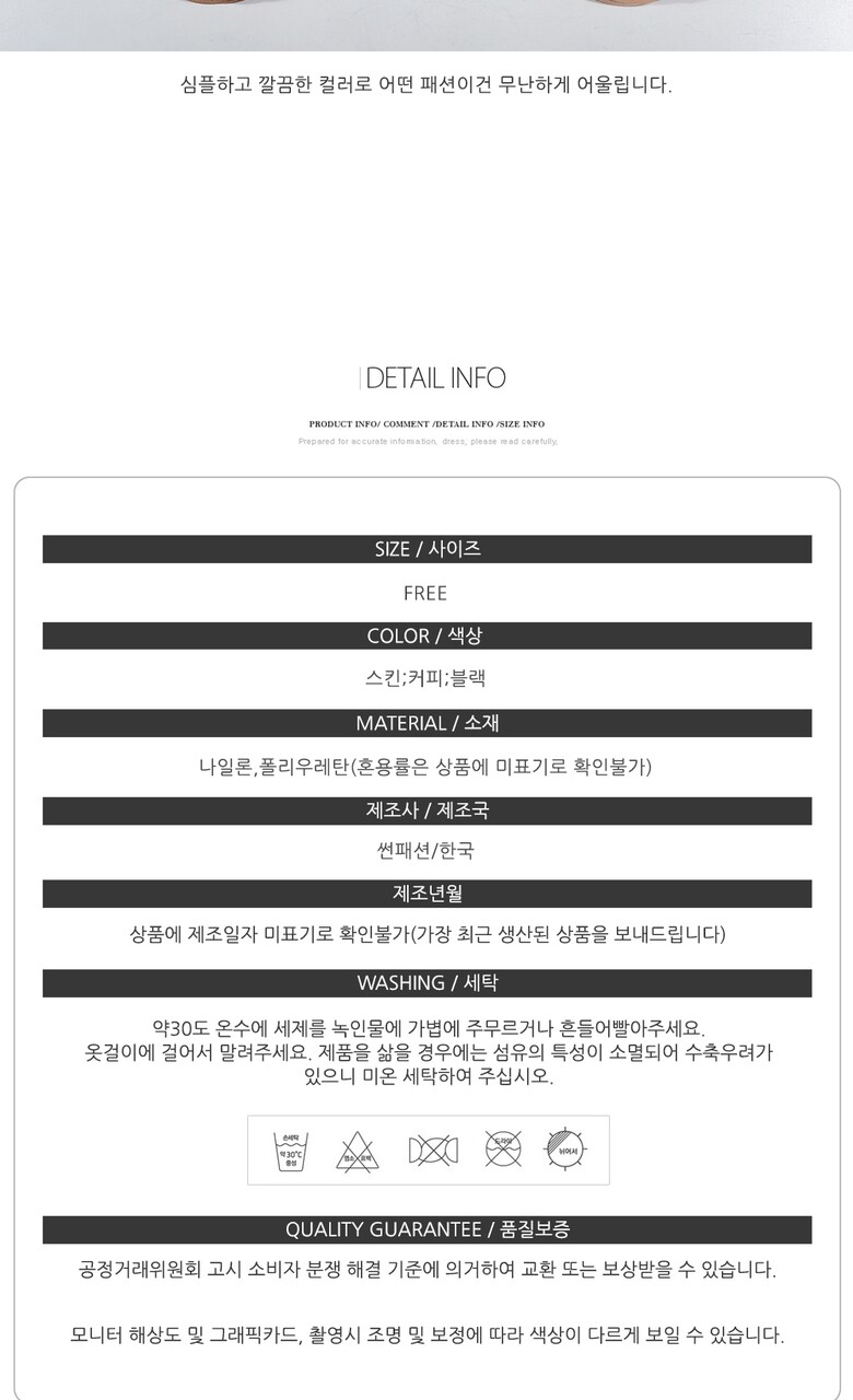 1. 제품 소재 (섬유의 조성 또는 혼용률을 백분율로 표시, 기능성인 경우 성적서 또는 허가서) 나일론/폴리우레탄(혼용률은 상품에 미표기로 확인불가)