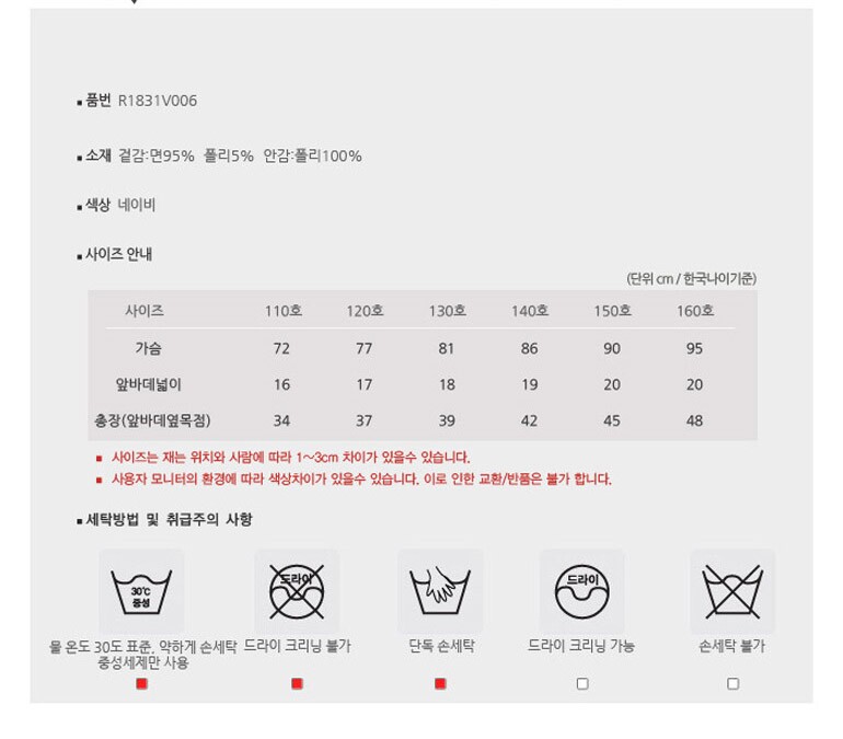 1. 제품 소재 (섬유의 조성 또는 혼용률을 백분율로 표시, 기능성인 경우 성적서 또는 허가서) | 겉감:면95% 폴리5% 안감:폴리100% |