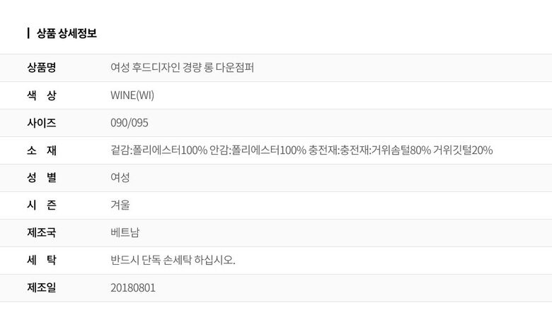 | 1. 제품 소재 (섬유의 조성 또는 혼용률을 백분율로 표시, 기능성인 경우 성적서 또는 허가서) | 겉감:폴리에스터100% 안감:폴리에스터100% 충전재:충전재:거위솜털80% 거위깃털20% |