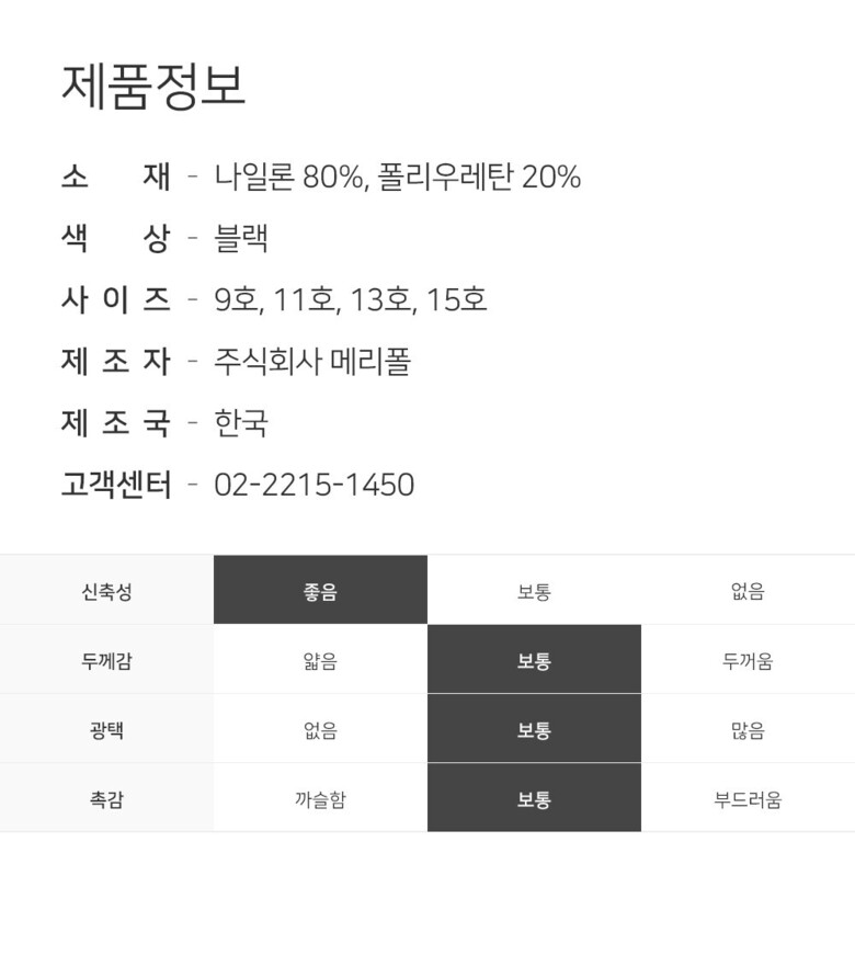 | 1. 제품 소재 (섬유의 조성 또는 혼용률을 백분율로 표시, 기능성인 경우 성적서 또는 허가서) | 나일론 80%, 폴리우레탄 20% |