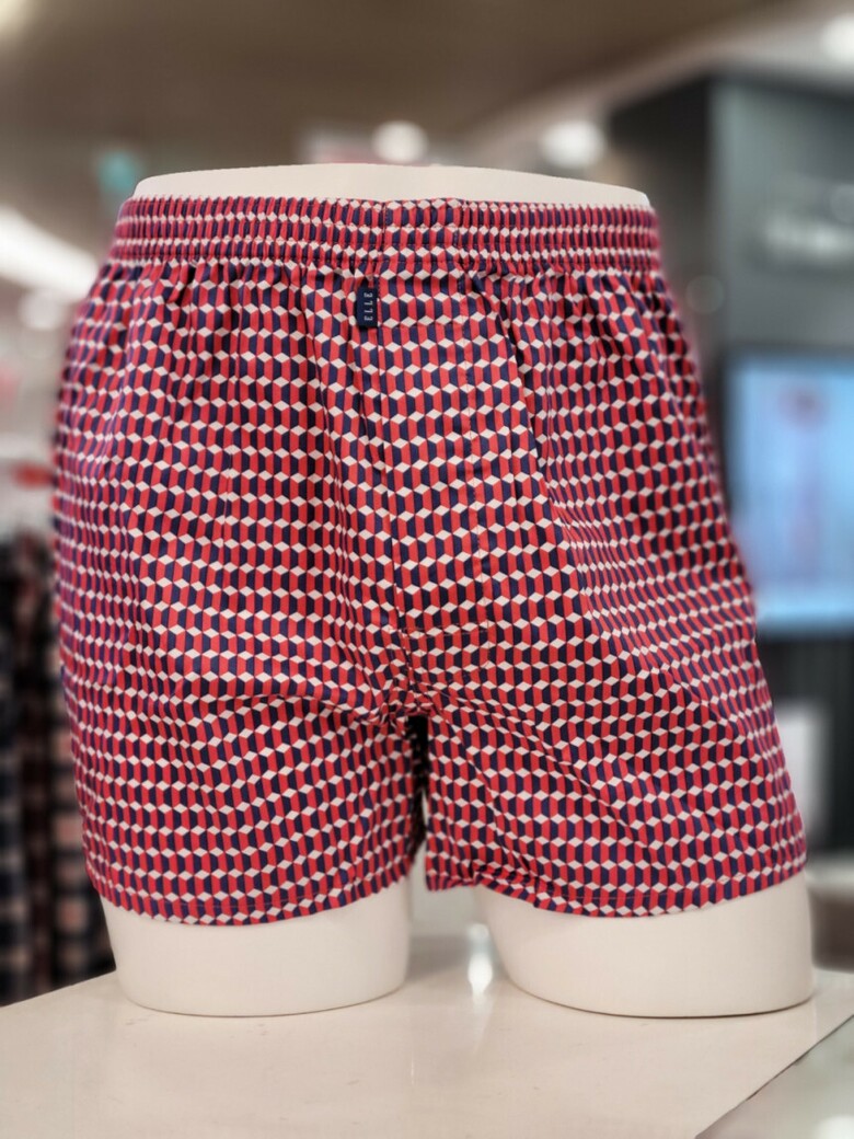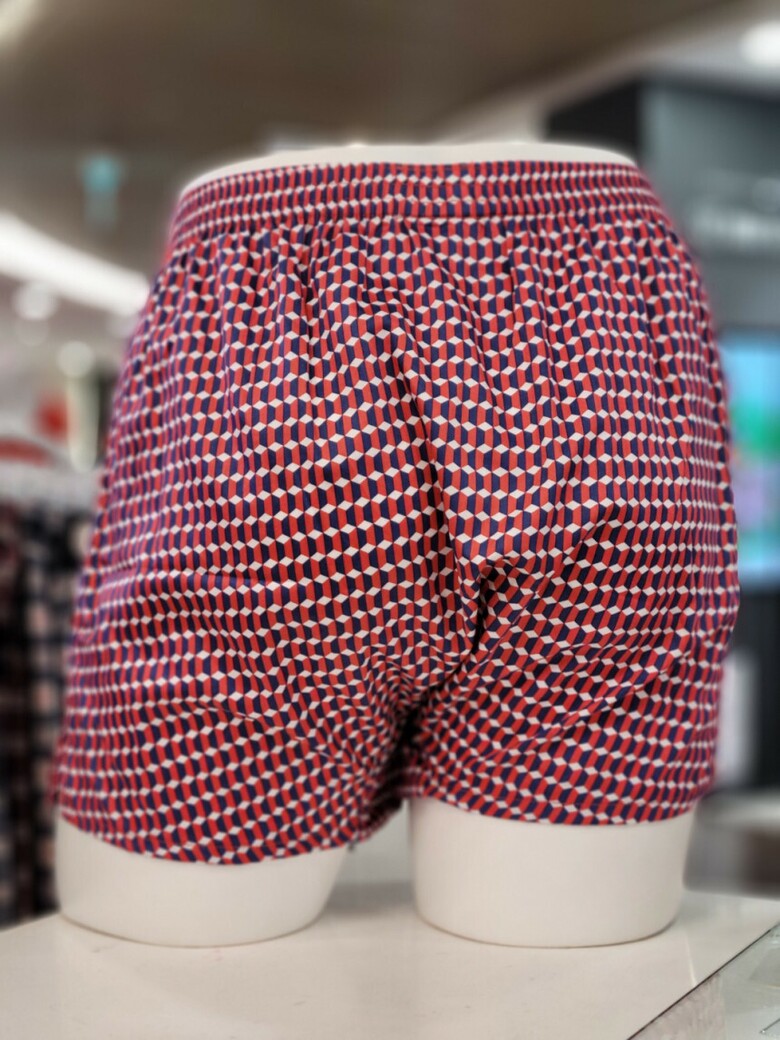 핑크 색상에 기하학 패턴이 매력적인 디자인의 남성 트렁크입니다.