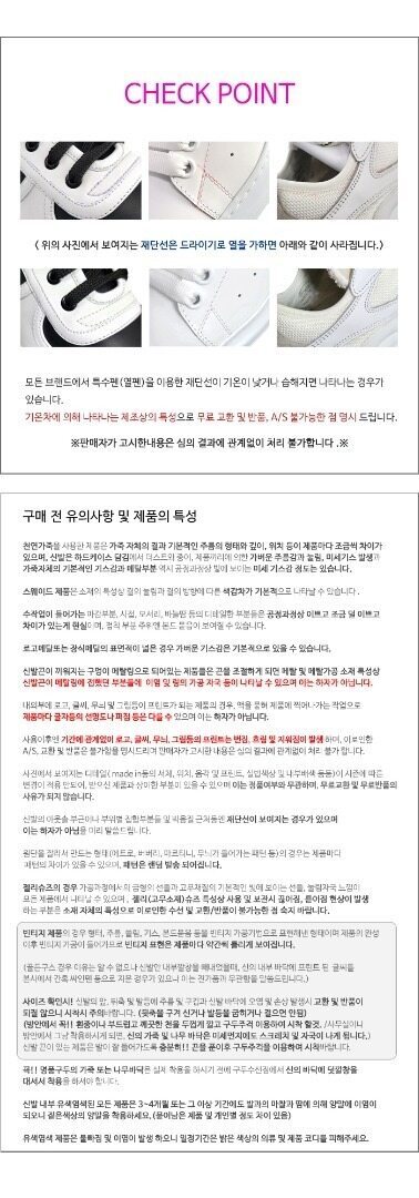 유의사항 신발의 경우 지면과 닿을 수밖에 없는 형태나 부드러운 재질감등의 특성, 개인적 착화 및 도보 스타일에 따른 가죽 및 패브릭 등 제품의 손상 및 쓸림, 마모가 사용기간과는 별개로 정도의 차이로 발생 할 수 밖에 없는 내용으로 당사의 품질보증내용 (A/S, 교환, 반품 등)에 포함되지 않습니다.