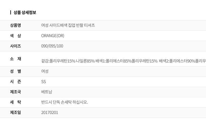 | 1. 제품 소재 (섬유의 조성 또는 혼용률을 백분율로 표시, 기능성인 경우 성적서 또는 허가서) | 겉감:폴리우레탄15% 나일론85% 배색1:폴리에스터85%폴리우레탄15% 배색2:폴리에스터90%폴리우레탄10%배색3:폴리에스터88%폴리우레탄12% |