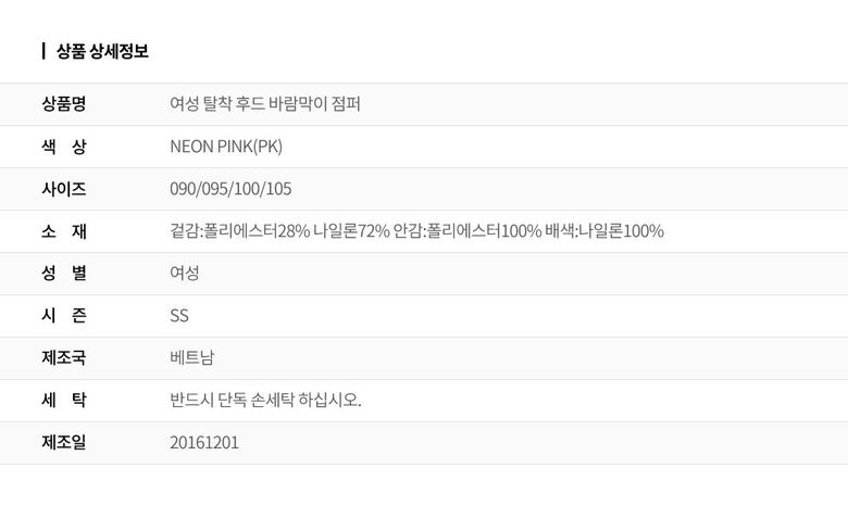 | 1. 제품 소재 (섬유의 조성 또는 혼용률을 백분율로 표시, 기능성인 경우 성적서 또는 허가서) | 겉감:폴리에스터28% 나일론72% 안감:폴리에스터100% 배색:나일론100% |