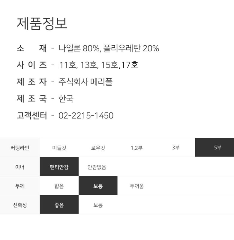 | 1. 제품 소재 (섬유의 조성 또는 혼용률을 백분율로 표시, 기능성인 경우 성적서 또는 허가서) | 나일론 80%, 폴리우레탄 20% |
