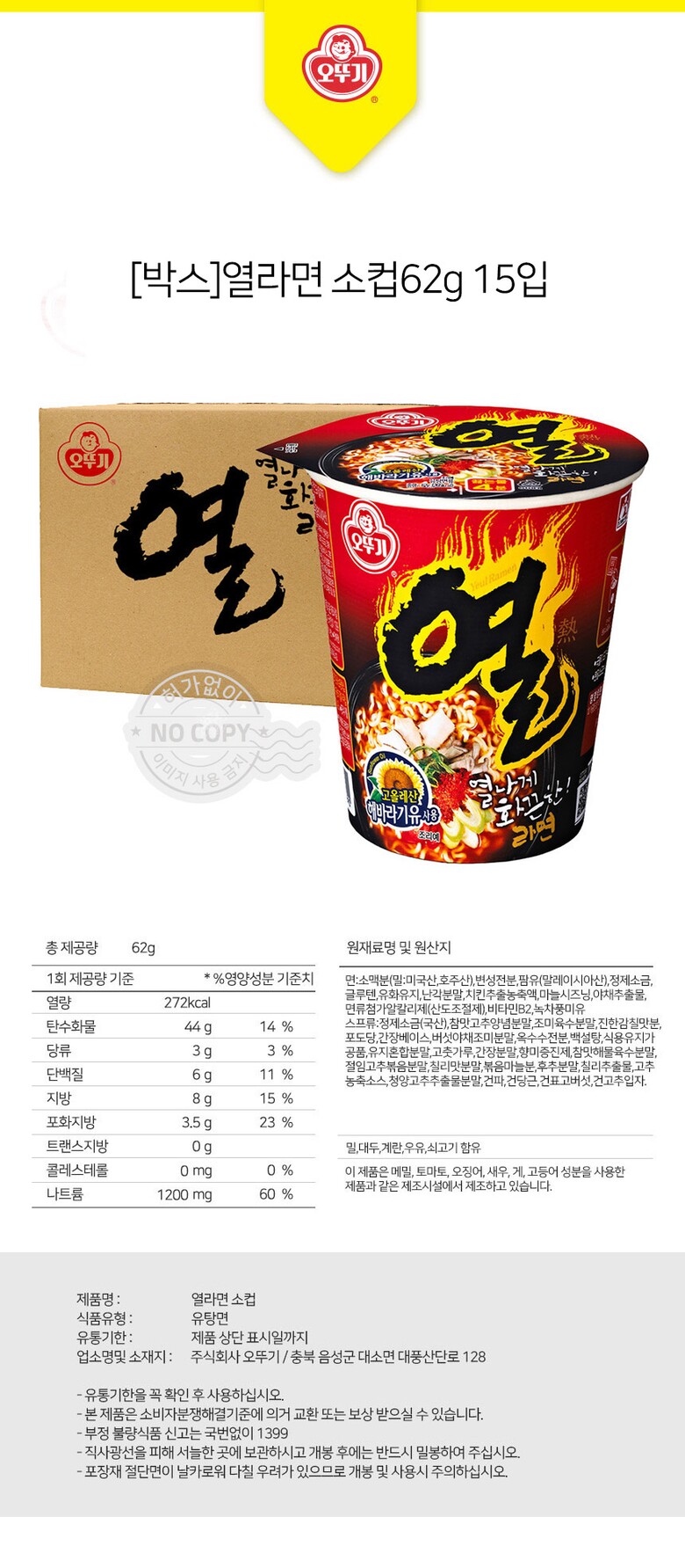 해당 상품은 [ [박스] 오뚜기 열라면 소컵 62g 15입 ] 구성의 상품입니다.