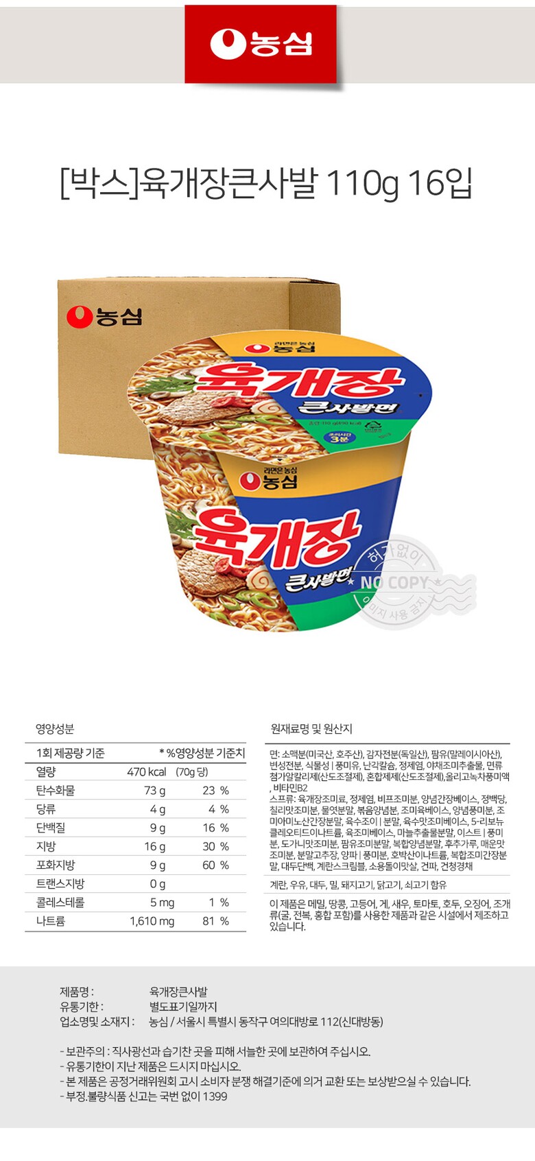해당 상품은 [ [박스] 농심 육개장큰사발 110g 16입 ] 구성의 상품입니다.
