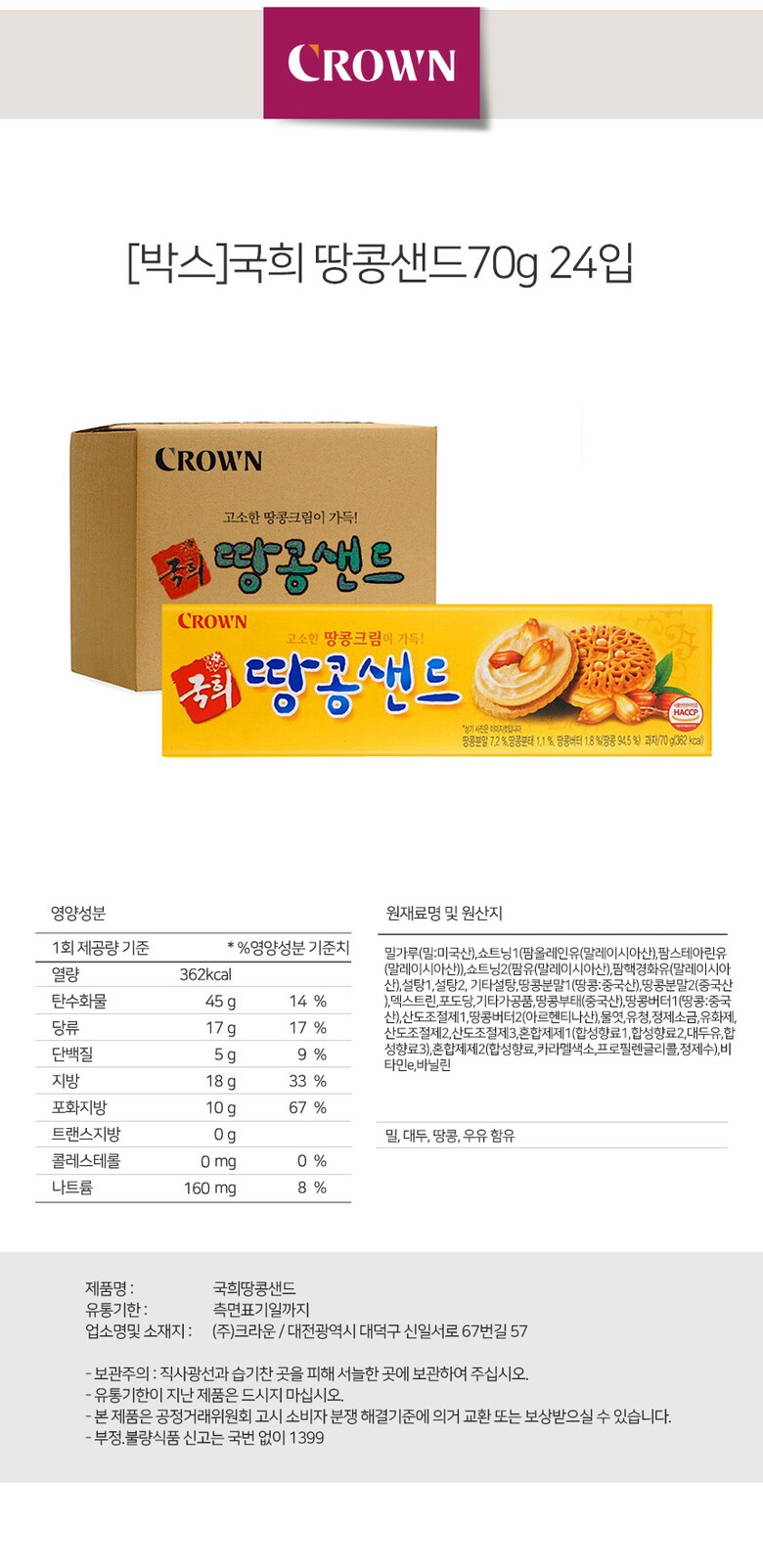 해당 상품은 [ [박스] 크라운 국희 땅콩샌드 70g 24입 ] 구성의 상품입니다.
