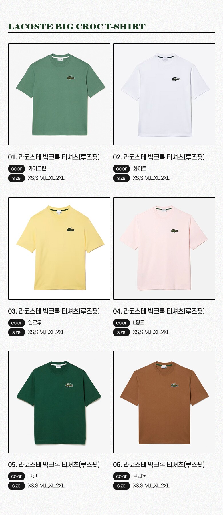 라코스테 남녀공용 빅크록 오가닉 루즈핏 티셔츠 6종 택1