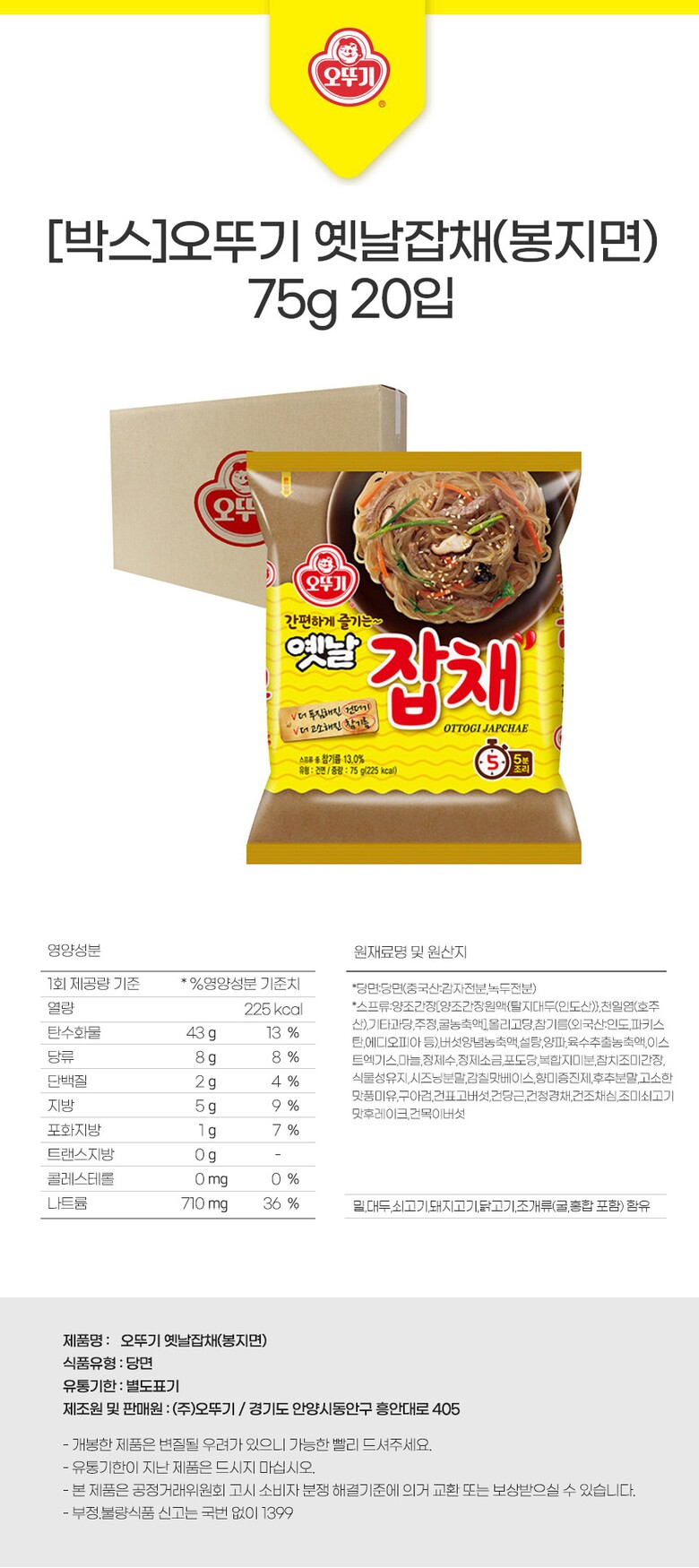 | 1. 포장단위별 용량(중량),수량,크기 | [박스]오뚜기 옛날잡채(봉지면) 75g 20입 (1500g) |