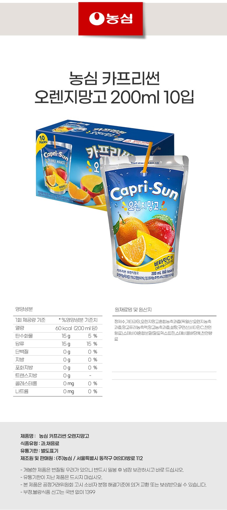 해당 상품은 [농심 카프리썬 오렌지망고 200ml 10입 (2000ml) ] 구성의 상품입니다.
