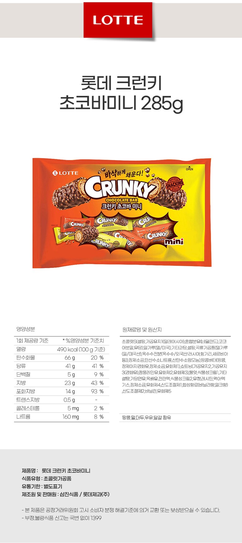 | 1. 포장단위별 용량(중량),수량,크기 | 롯데 크런키 초코바미니 285g (285g) |