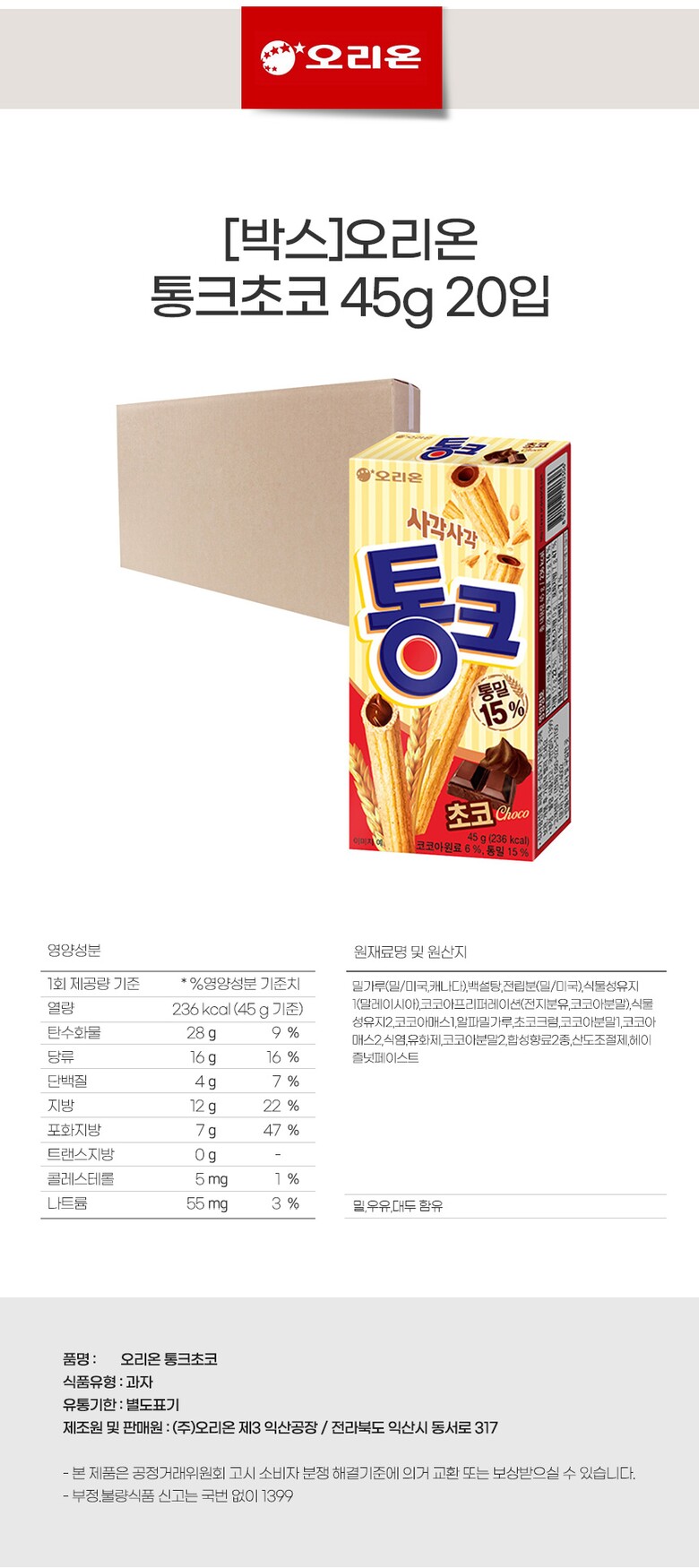 해당 상품은 [[박스]오리온 통크초코 45g 20입 (900g) ] 구성의 상품입니다.
