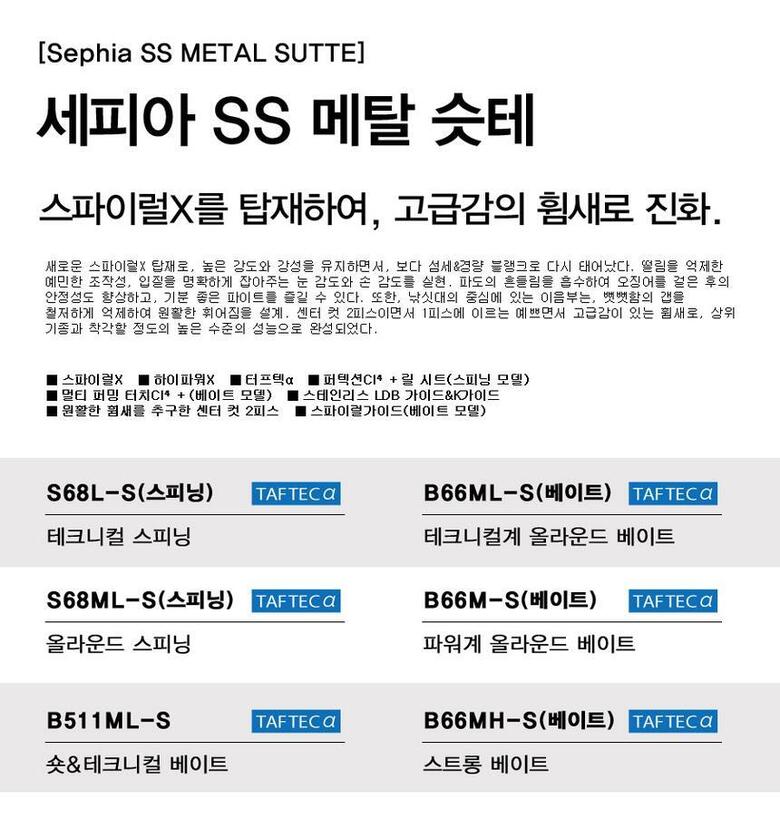 | 품명 | 전장 (m) | 절수 (본) | 접은길이 (cm) | 자중 (g) | 선경 (mm) | 적합슷테 사이즈(호/g) | 적합라인 PE(호) | 릴시트 위치(mm) | 카본 함유율(%) |