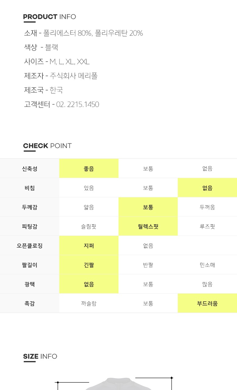 1. 제품 소재 (섬유의 조성 또는 혼용률을 백분율로 표시, 기능성인 경우 성적서 또는 허가서) | 폴리에스터 80% , 폴리우레탄 20% |