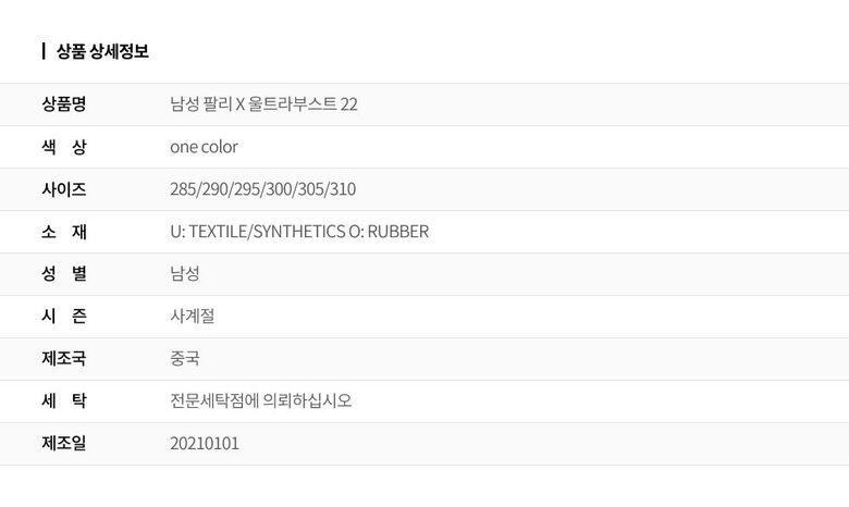 | 1. 제품 소재 (섬유의 조성 또는 혼용률을 백분율로 표시, 기능성인 경우 성적서 또는 허가서) | U: TEXTILE/SYNTHETICS O: RUBBER |