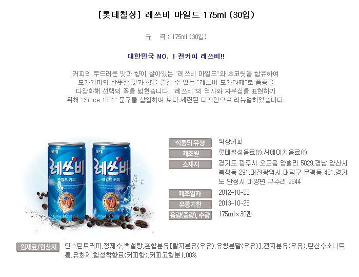 [롯데칠성] 레쓰비 마일드 175ml (30입)