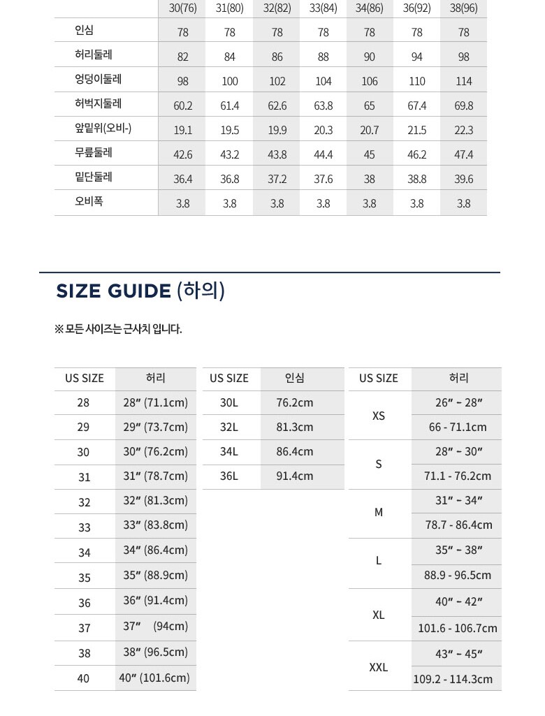 3. 치수 | 76(30),80(31),82(32),84(33),86(34),92(36),96(38) |