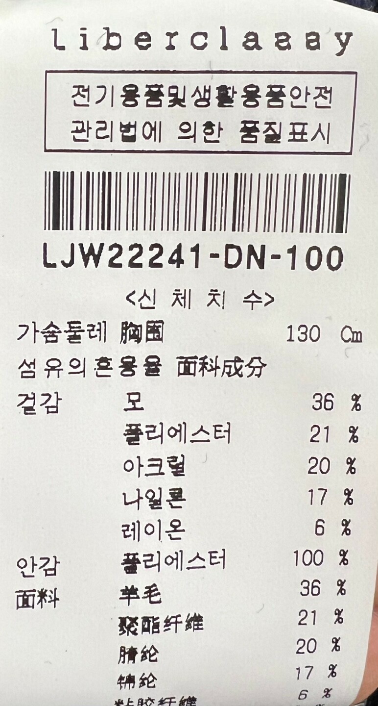 1. 제품 소재 (섬유의 조성 또는 혼용률을 백분율로 표시, 기능성인 경우 성적서 또는 허가서) 겉감:모 36%, 폴리에스테르 21%, 아크릴 20%, 나일론 17%, 레이온 6%