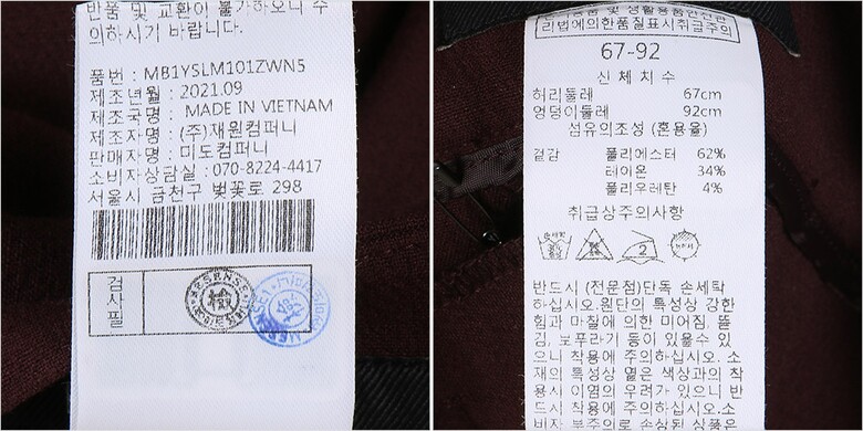 1. 제품 소재 (섬유의 조성 또는 혼용률을 백분율로 표시, 기능성인 경우 성적서 또는 허가서) 겉감:폴리에스터62% 폴리우레탄4% 레이온34%