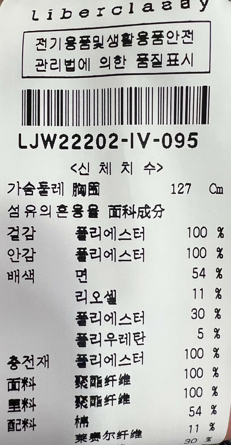 | 1. 제품 소재 (섬유의 조성 또는 혼용률을 백분율로 표시, 기능성인 경우 성적서 또는 허가서) | 안감:폴리에스테르 100% / 배색:면 54%, 리오셀 11%, 폴리에스테르 3 |