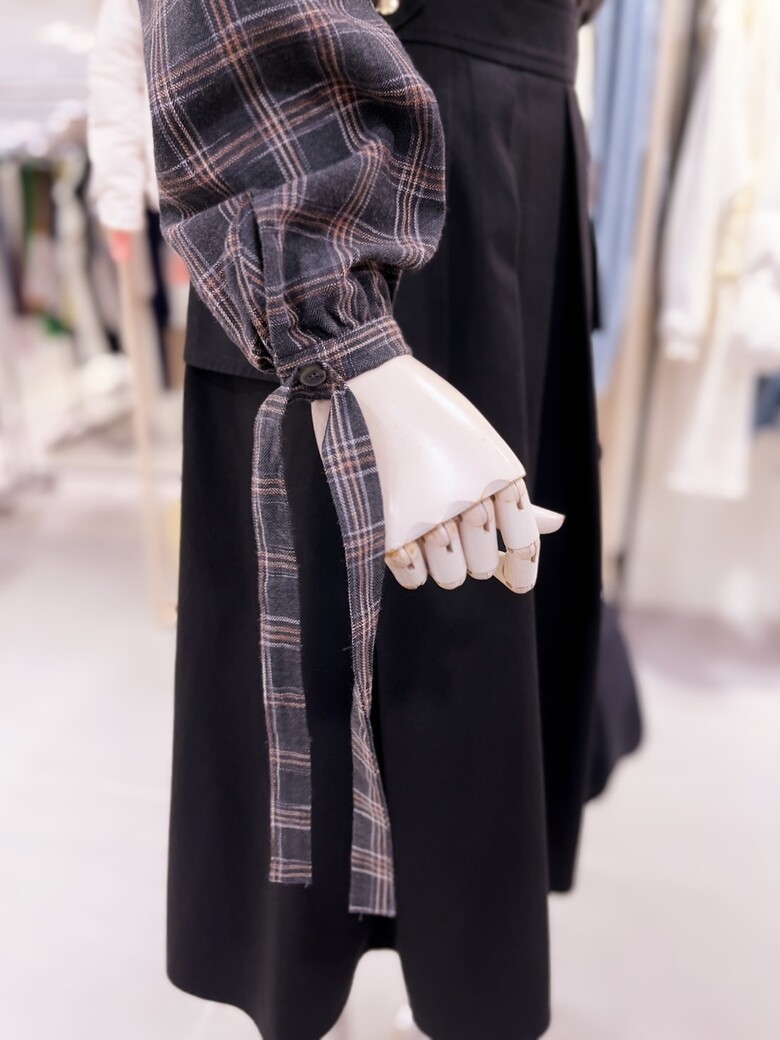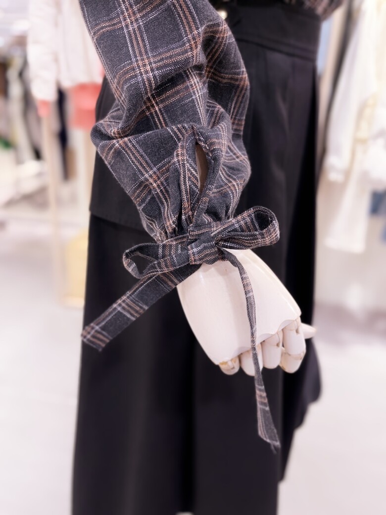 프릴 디테일 셔링 소매 체크 셔츠?체크 패턴이 멋스러우며?티테일 리본이 러블리한 셔츠 입니다.