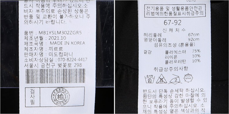 | 1. 제품 소재 (섬유의 조성 또는 혼용률을 백분율로 표시, 기능성인 경우 성적서 또는 허가서) | 겉감:폴리에스터75% 폴리우레탄10% 레이온10% |