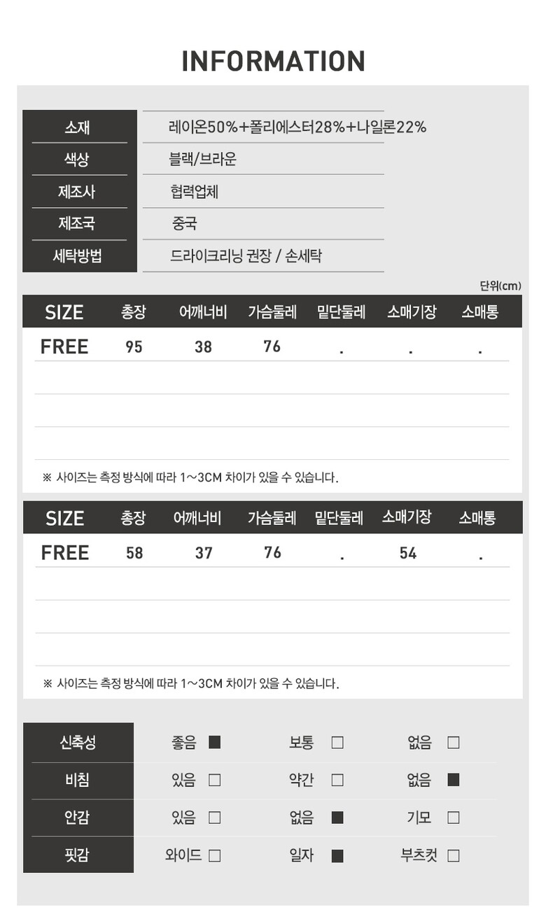 • 처음 배송된 상품상태와 다를 경우(세탁/착용 후 외출하신 경우) 반품이 불가합니다.