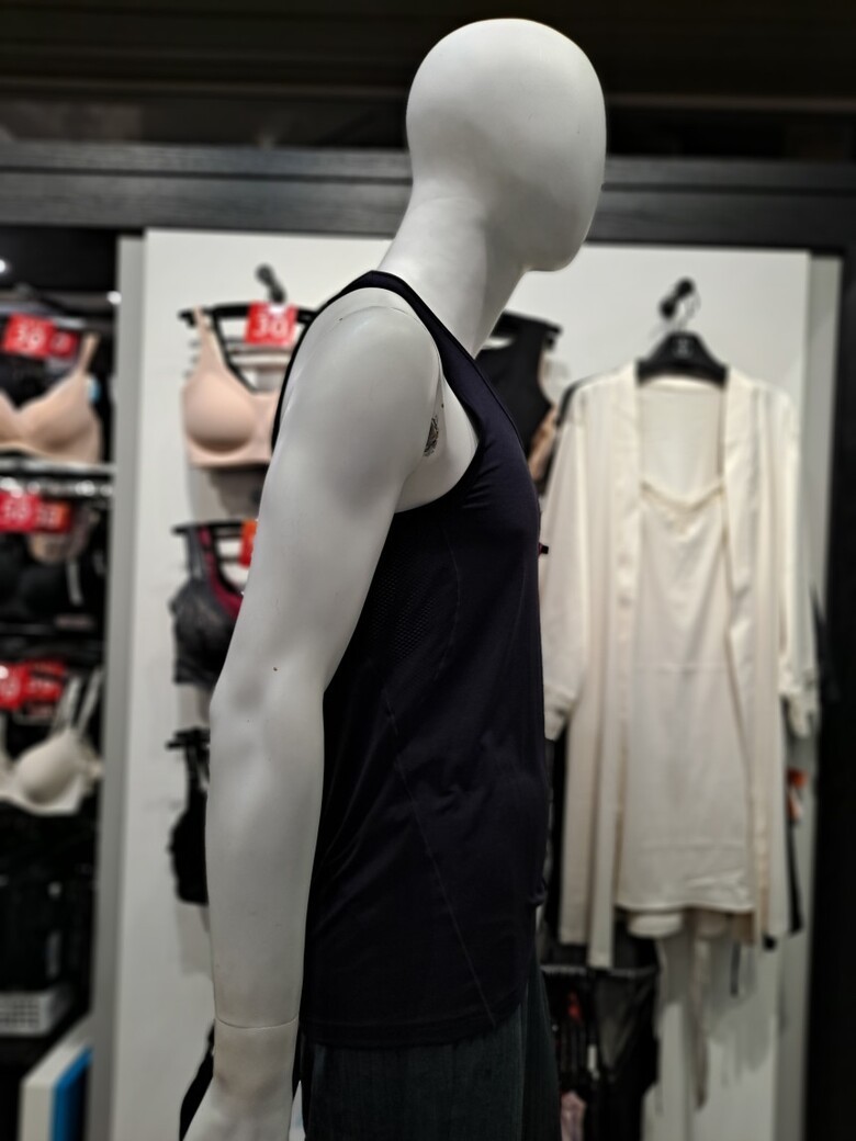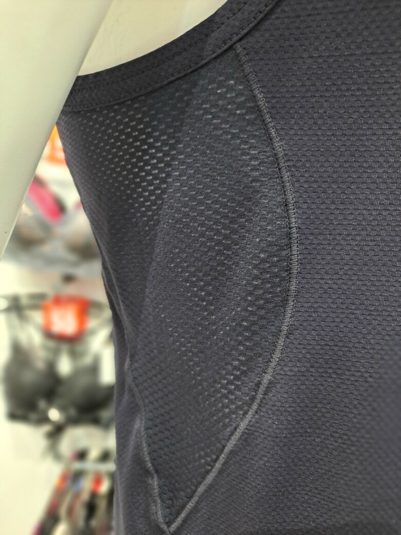 겨드랑이 부분에 조직감이 다른 메쉬를 매치하여 스포티한 느낌을 살림.