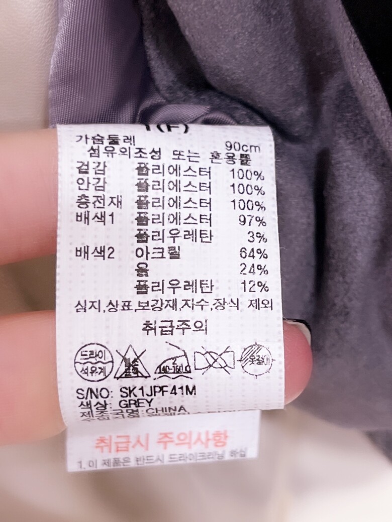 제품소재 : 겉감,안감,충전재- 폴리에스터100% 배색1-폴리에스터97% 폴리우레탄3% 배색2-아크릴64% 울24% 폴리우레탄12%