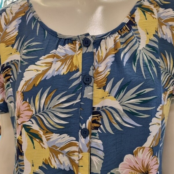 려한 나뭇잎플라워 패턴으로 레이온소재의 시원한 제품 시원한 칼라감의 팜트리 패턴의 가운제품.