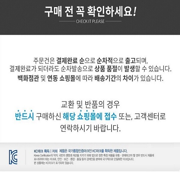 상품불량에 의한 반품, A/S, 품질보증 및 피해보상 등에 관한 사항은 소비자 분쟁해결기준(공정거래위원회 고시) 구매자가 미성년자인 경우에는 상품 구입시 법정대리인이 동의하지 아니하면 미성년자 본인 또는 법정대리인이 구매취소 할 수 있습니다. |