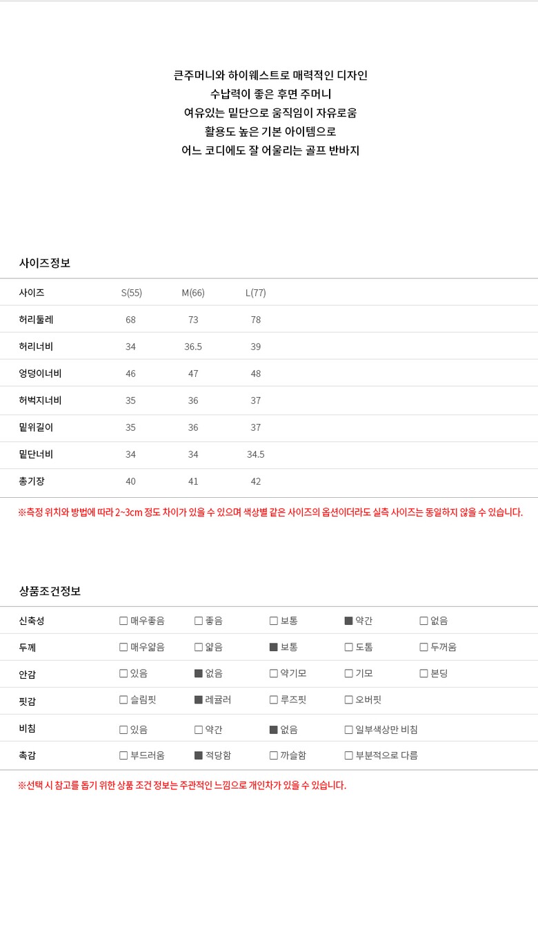보스케 여성 봄 여름 골프웨어 골프 편한 데일리 카고 반바지 L30112333